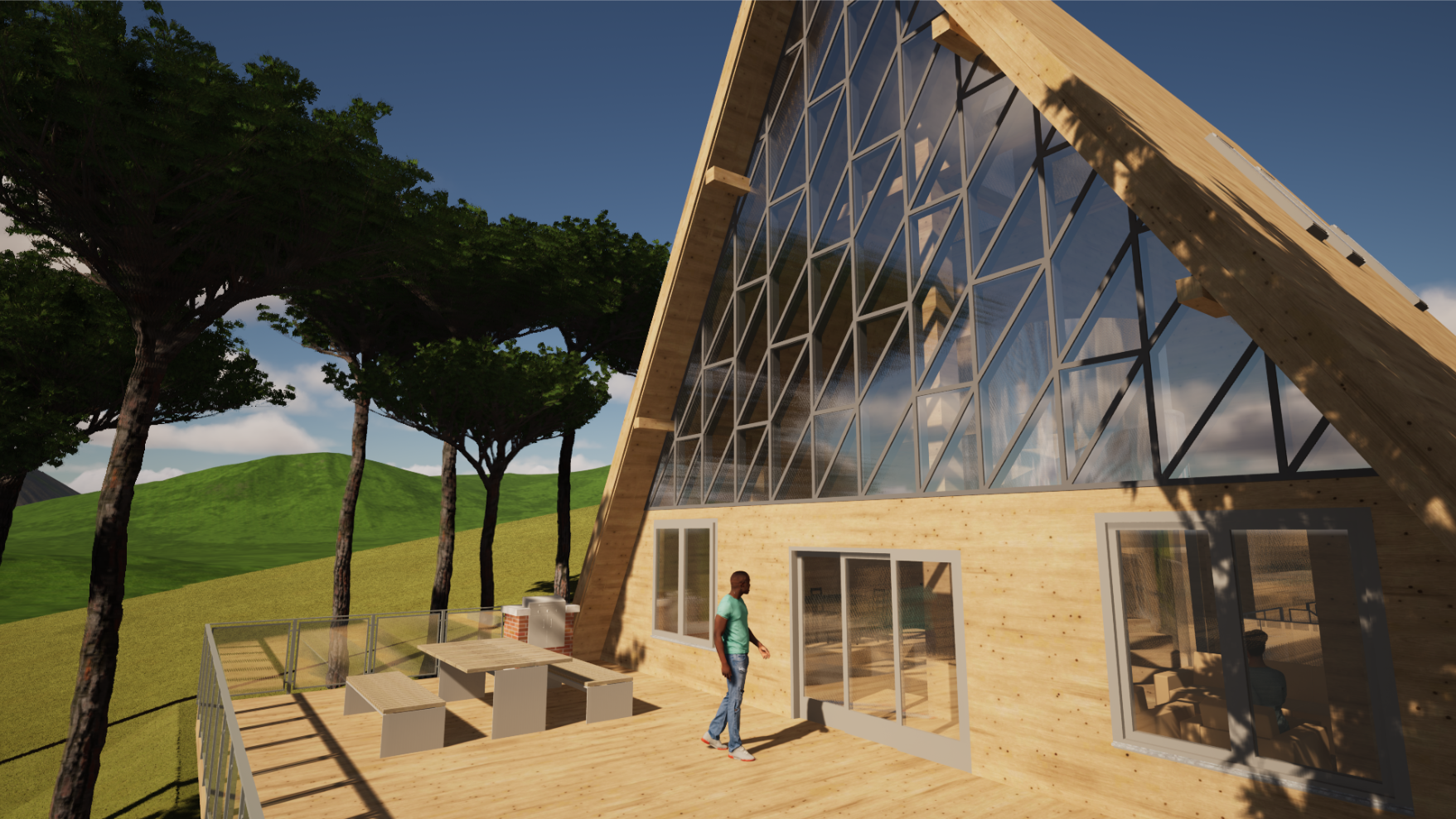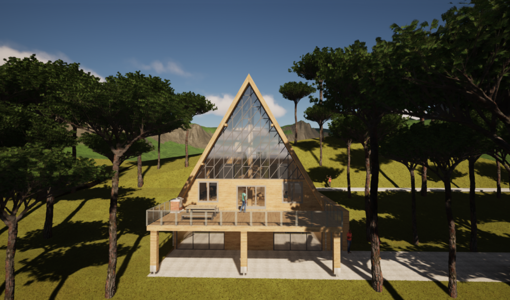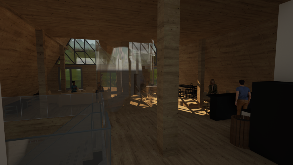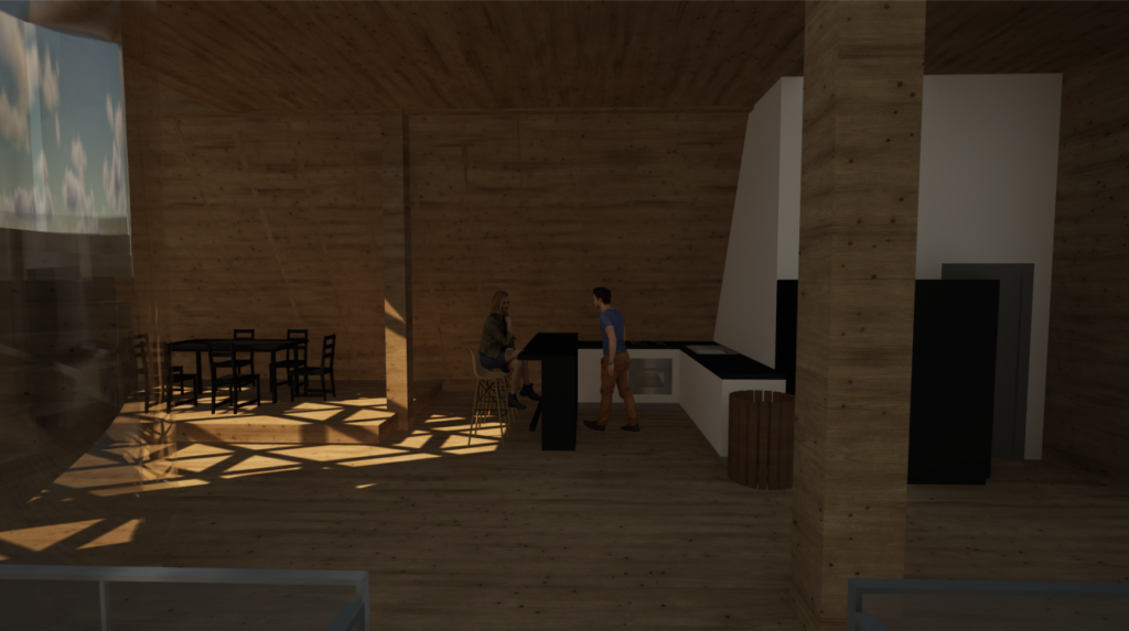 Im ersten Stock befindet sich ebenfalls ein Eingang, sowie eine Schiebetür zum Panoramabalkon. Ein offener Treppenraum verbindet die Eingangshalle im Erdgeschoss mit dem vielseitigen Aufenthaltsraum im Obergeschoss, der eine offene Küche, einen Essbereich auf einem Podest, sowie einen Loungebereich in Richtung Balkon beinhaltet.