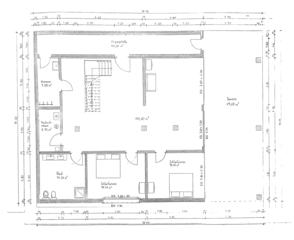 EG: 2 Doppelschlafzimmer, Badezimmer, Technikraum, Garage mit separatem Eingang, Loungebereich