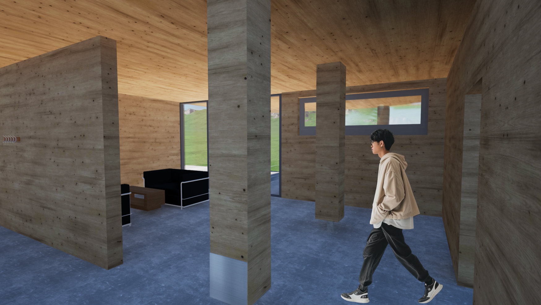 Das Erdgeschoss besteht aus einem langen Gang, der sowohl zur Eingangstür, als auch zum Abstellraum führt und einem Technikraum. Von der Eingangshalle zweigen zwei Doppelschlafzimmer, ein großes Bad, die Lounge mit Seeblick, der Technikraum und der anfangs genannte Abstellraum ab, der sowohl von innen als auch von außen betretbar ist. Die Tür zur Terrasse kann geöffnet werden, um den Raum nach außen zu erweitern.
