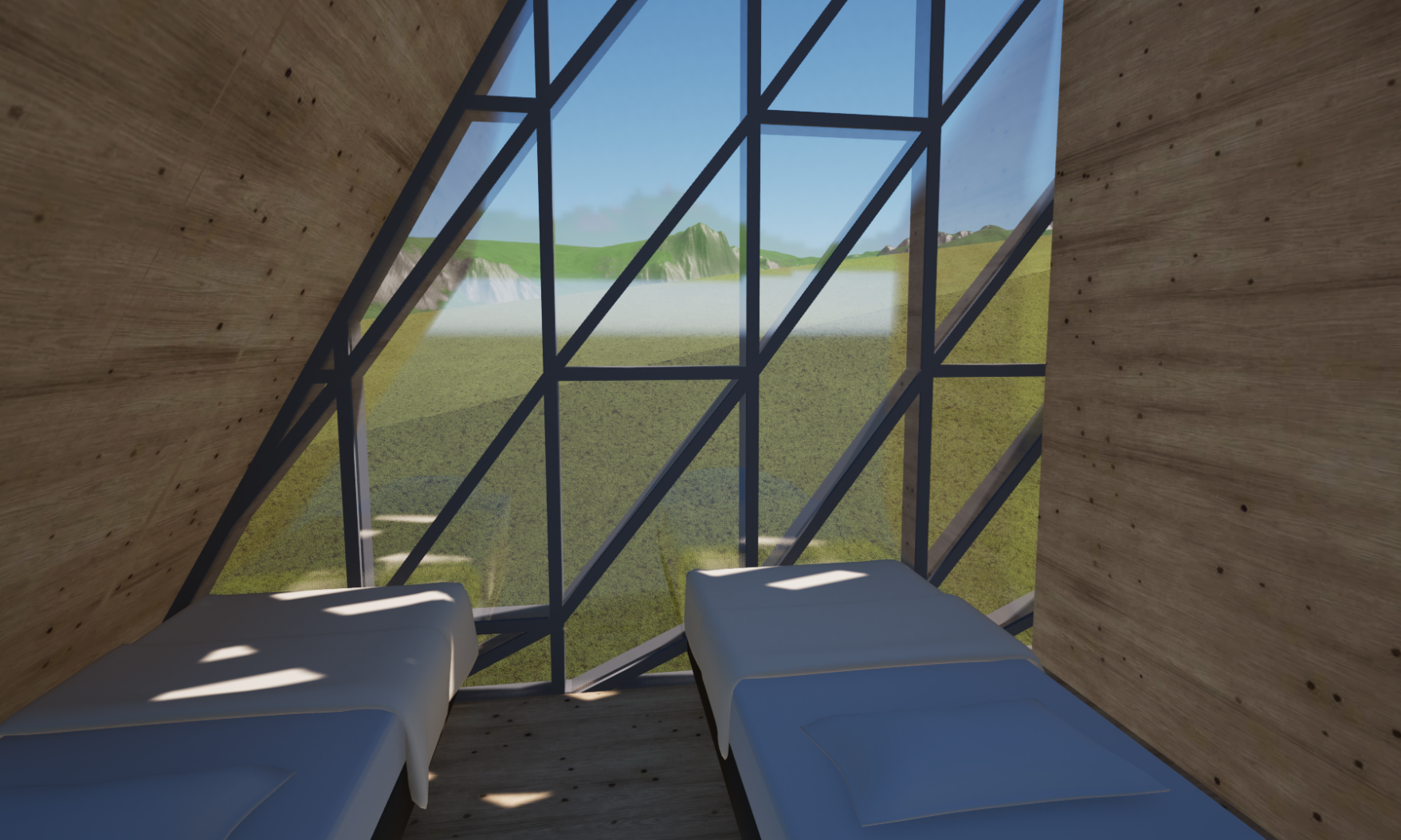 Eine zentrale Spindeltreppe mit Glas-geländer führt ins Dachgeschoss, das einen offenen Loft-Bereich, mit Blick sowohl auf den Wohnbereich als auch auf den See bietet. Außerdem gibt es zwei Doppel-zimmer mit Einzelbetten und einem kleinen Bad. Hier sind beide Giebelseiten verglast, sodass der Wohnraum nicht nur den See, sondern auch die leuchtenden Farben der Vegetation mit einschließt.