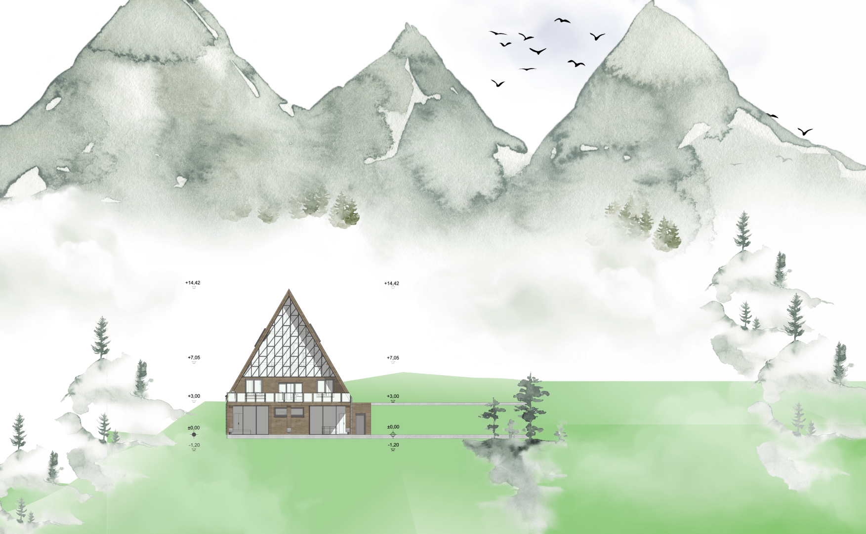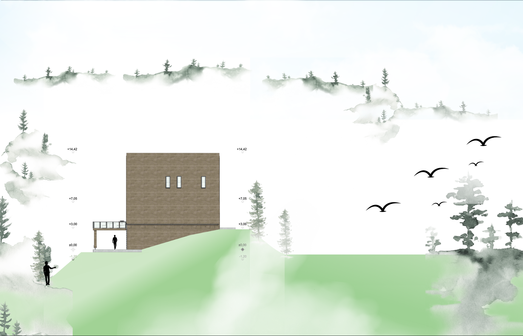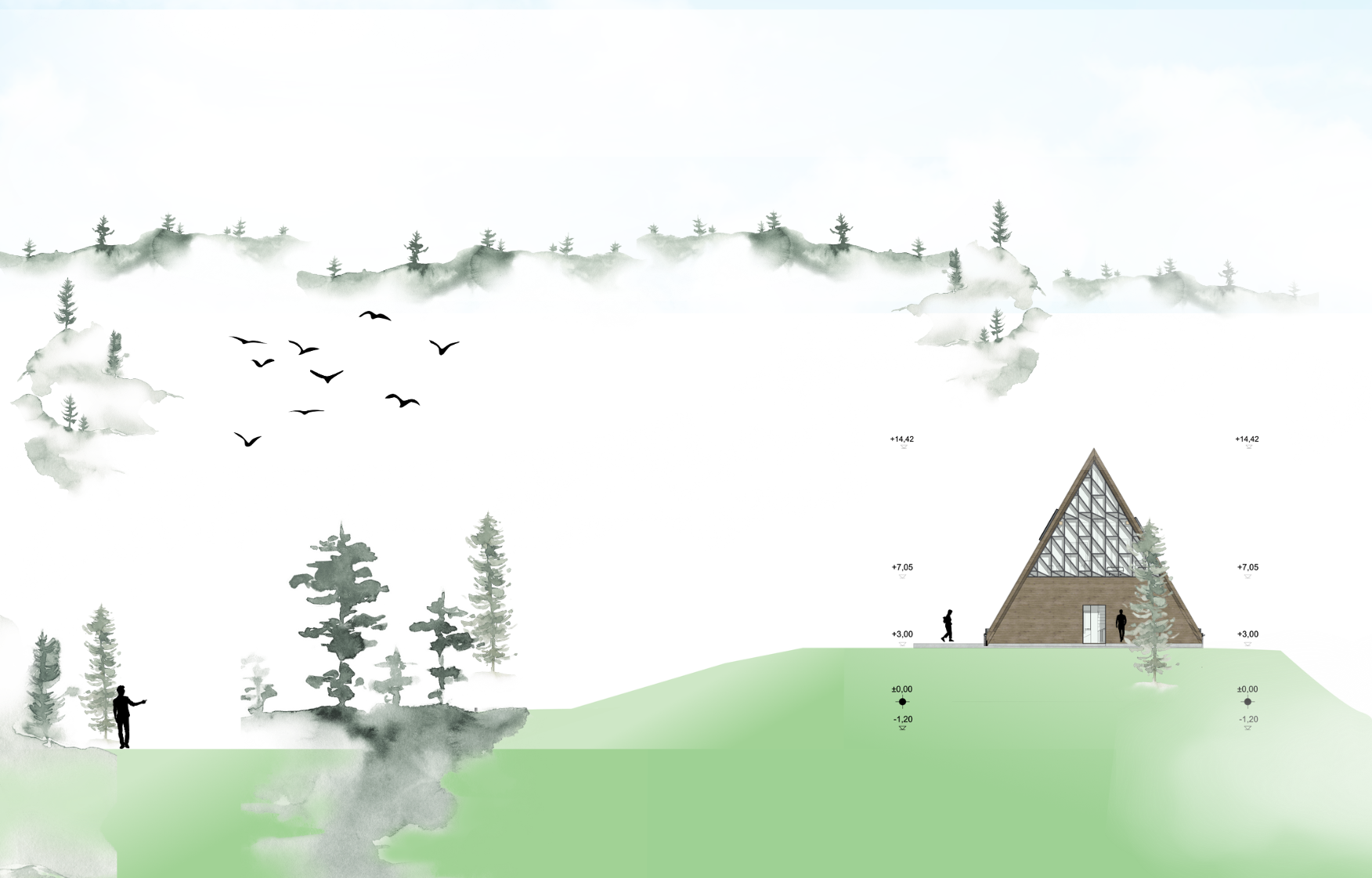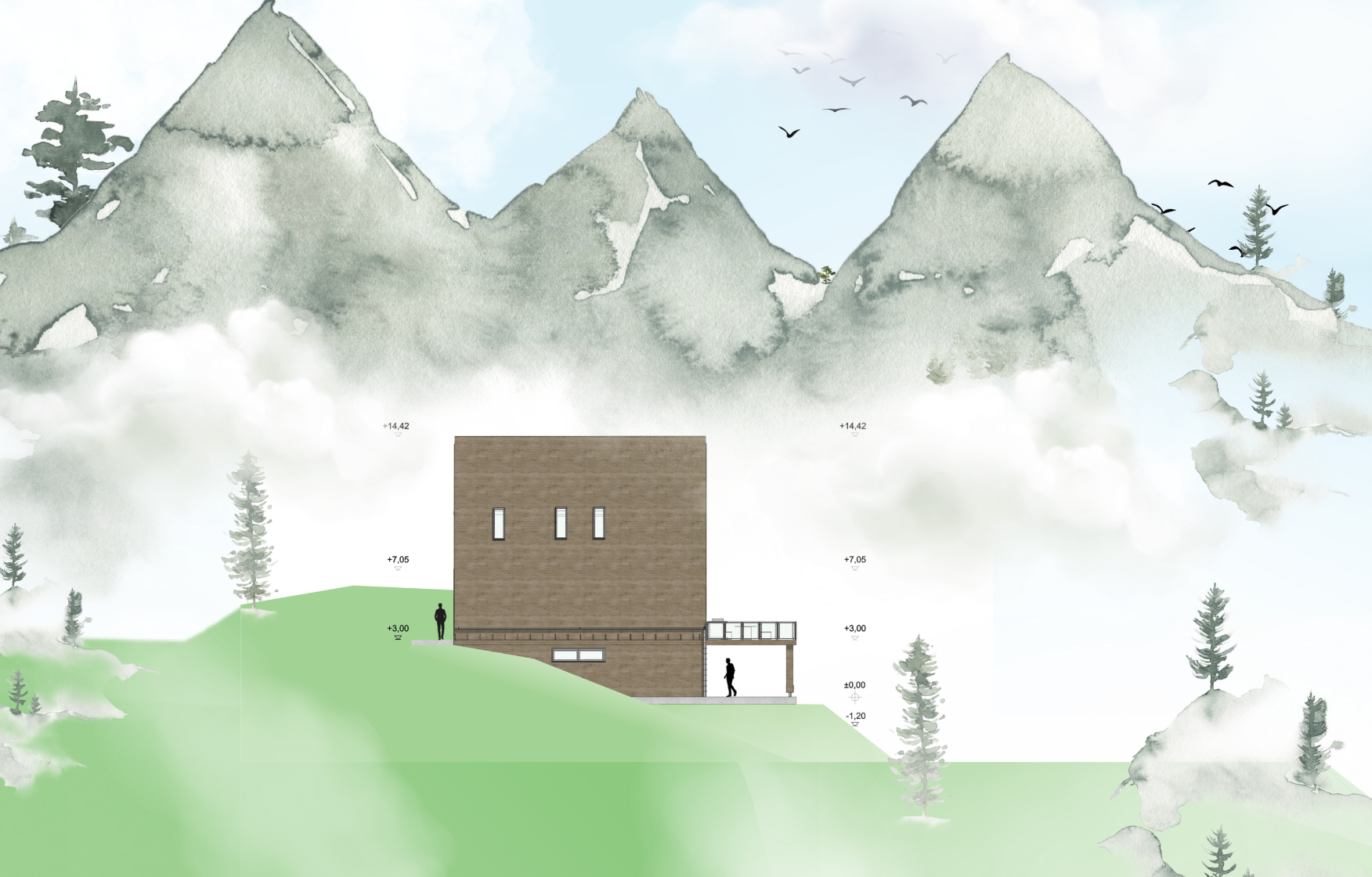 Das Haus versteht sich als Ziel und Zwischenstation zugleich: ein Ort für Wanderer und Pilger, an dem der Weg in die Aussicht übergeht. Architektur und Landschaft verschmelzen zu einem räumlichen Erlebnis, das Bewegung, Ankommen und Panorama in einem klaren Konzept vereint.
