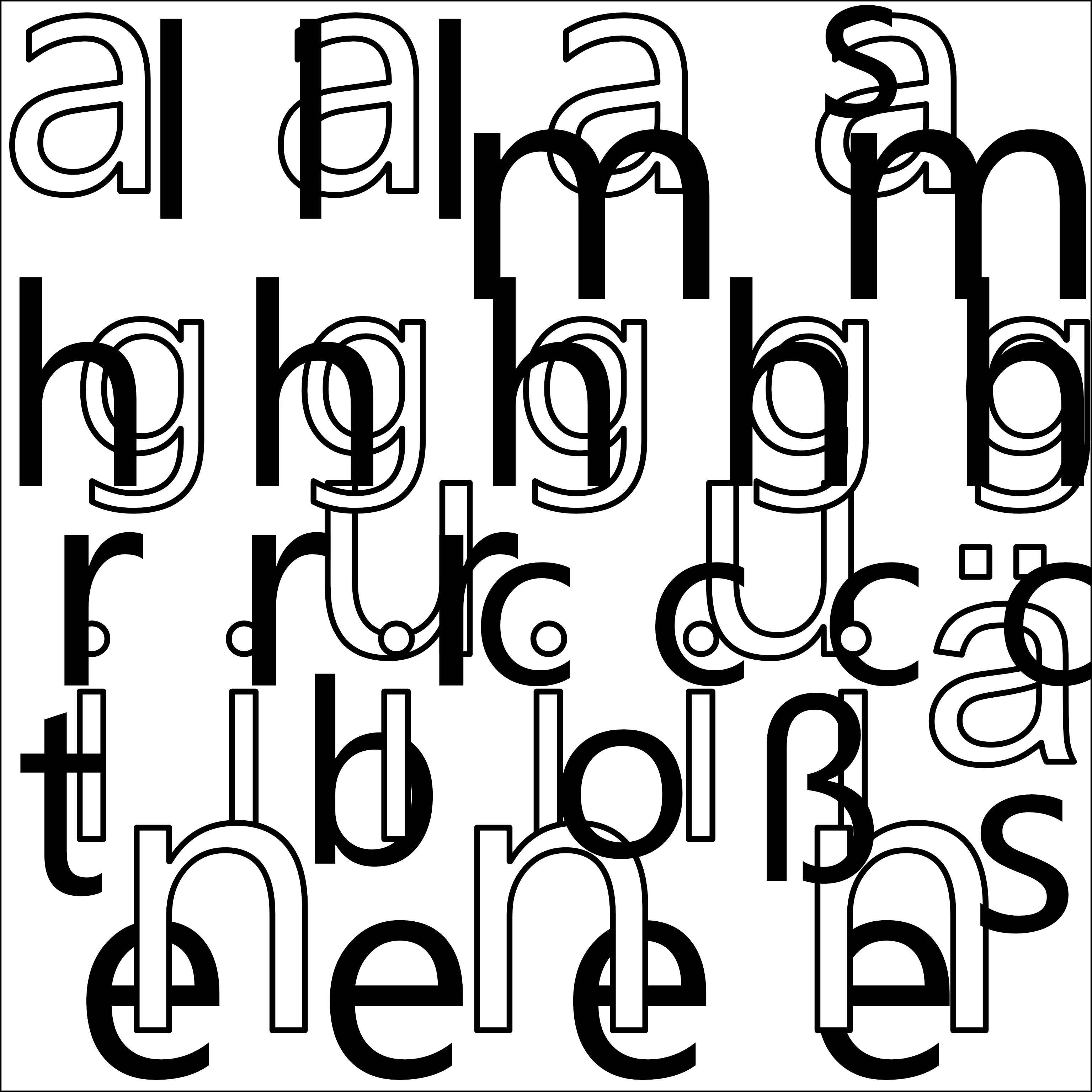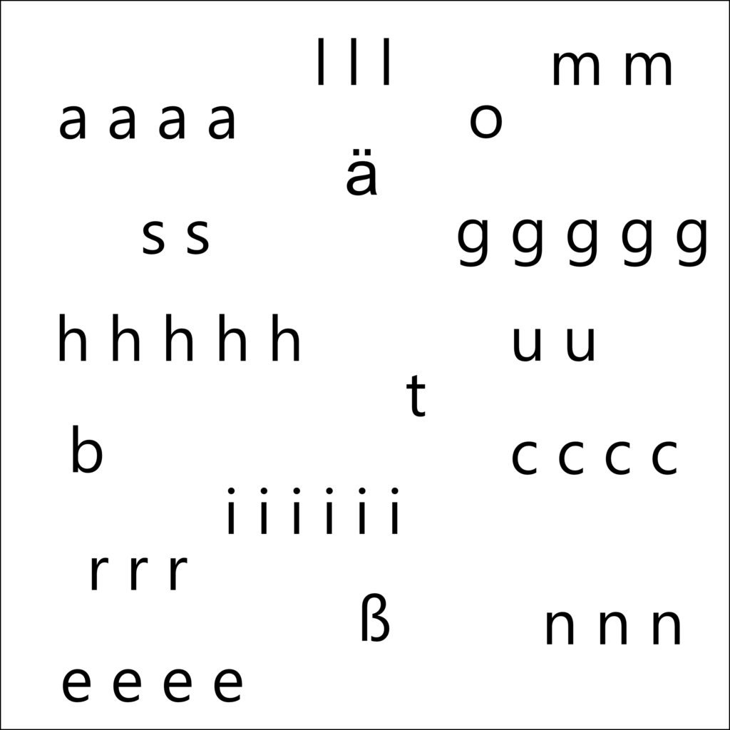 Ändere zunächst die Schriftgröße der Buchstaben, so dass Überlagerungen unvermeidlich sind. Gestalte dann eine neue Typokomposition mit Hilfe des Rasters aus 1.1. Wähle die restlichen Typoparameter um Buchstaben voneinander abzugrenzen und „sichtbar“ zu machen. Nutze keine Transparenz. Verwende „Ebenen- und Gruppierungsfunktionen“ deiner Software um den Überblick zu behalten. Erkunde die Grenzen der „Sichtbarkeit“! zeige das Ergebnis ohne Gestaltungsraster.